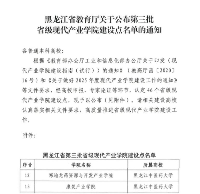 近日,黑龙江省教育厅印发《关于公布第三批省级现代产业学院建设点名单的通知》,我校“寒地龙药资源与开发产业学院”与“康复产业学院”成功入选。
