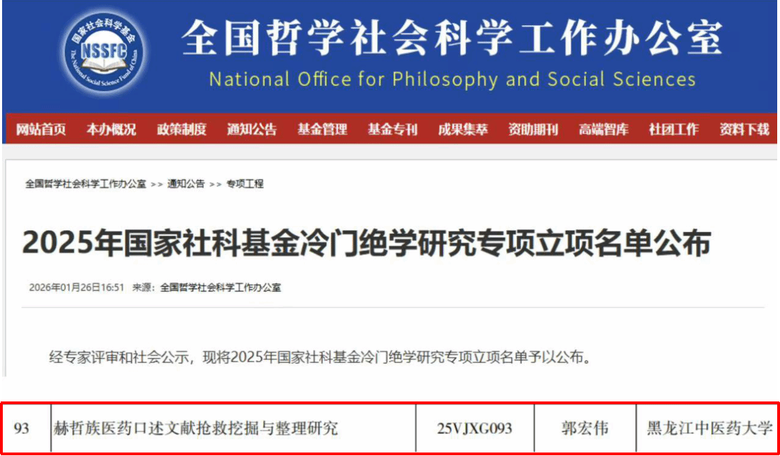 近日,全国哲学社会科学工作办公室公布2025年国家社科基金冷门绝学研究专项立项名单,我校郭宏伟教授牵头申报的课题获批学者个人项目。本次国家社科基金共立项冷门绝学研究专项学者个人项目94项,黑龙江省仅2个项目获批立项。