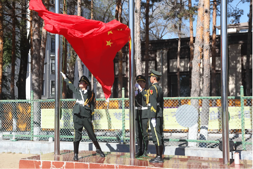 大会在庄严的国歌声中拉开帷幕。全场师生肃立,向冉冉升起的五星红旗行注目礼。