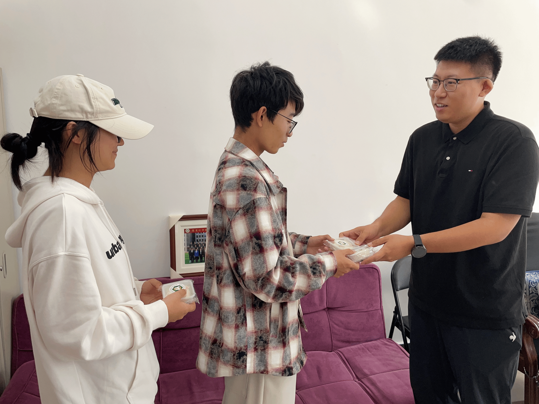各学院辅导员老师亲手将一份份满载情谊的月饼递到新生手中,并与他们亲切交流,询问入学后的适应情况,送上节日的问候。