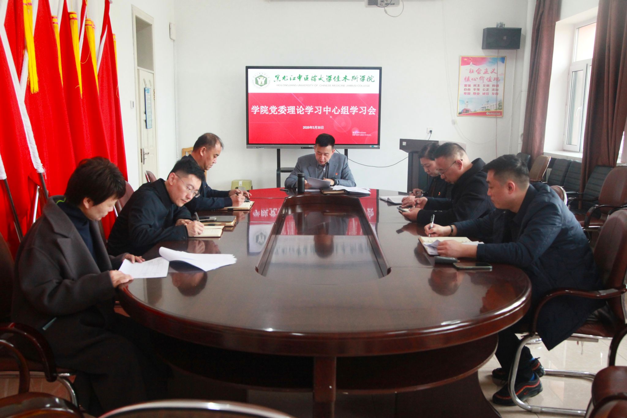 3月30日,佳木斯学院党委理论学习中心组在学院综合楼三楼会议室召开学习会,传达学习习近平总书记在全国两会期间的重要讲话精神及全省领导干部会议精神,紧密结合学院实际开展交流研讨。学院党委书记杜徽主持会议并作中心发言,学院党委理论学习中心组成员参加学习。
