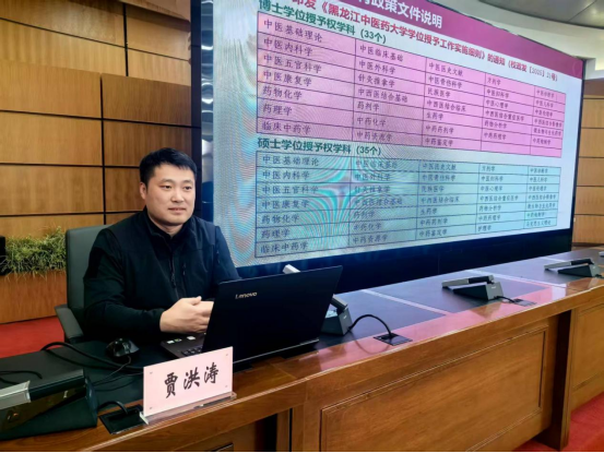 辅导员贾洪涛围绕学位授予、导师队伍建设、学位点建设等方面系统讲解《黑龙江中医药大学学位授予工作实施细则》《黑龙江中医药大学研究生学位论文或实践成果专家评阅管理办法》《黑龙江中医药大学研究生学术复核和学位复核实施办法(试行)》及学术成果认定、论文抽检等学位相关内容。