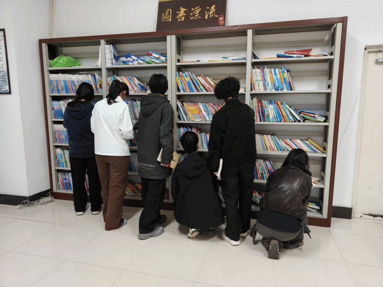 在“图书漂流”站,同学们写下读书寄语相互传递,通过书籍的流转与分享,延续对阅读的热爱。
